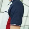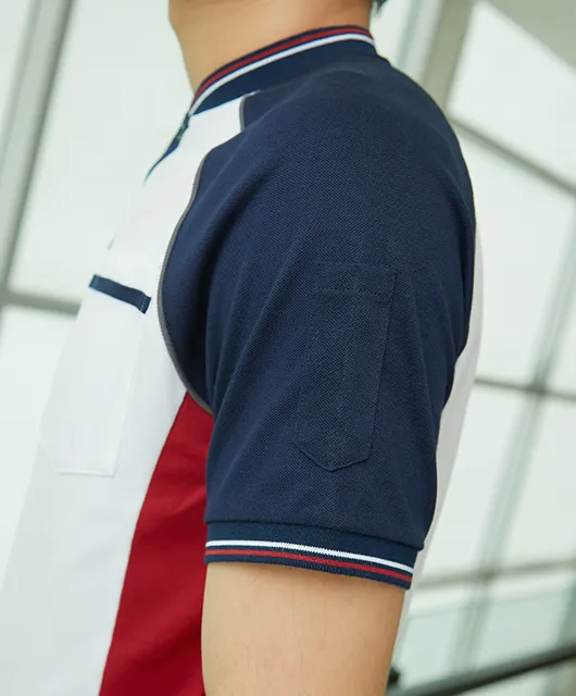 A formal mandarin-collar design enhanced by a bold red stripe on a navy base. Ideal for public-sector organizations or firms that seek to convey trust and authority.
